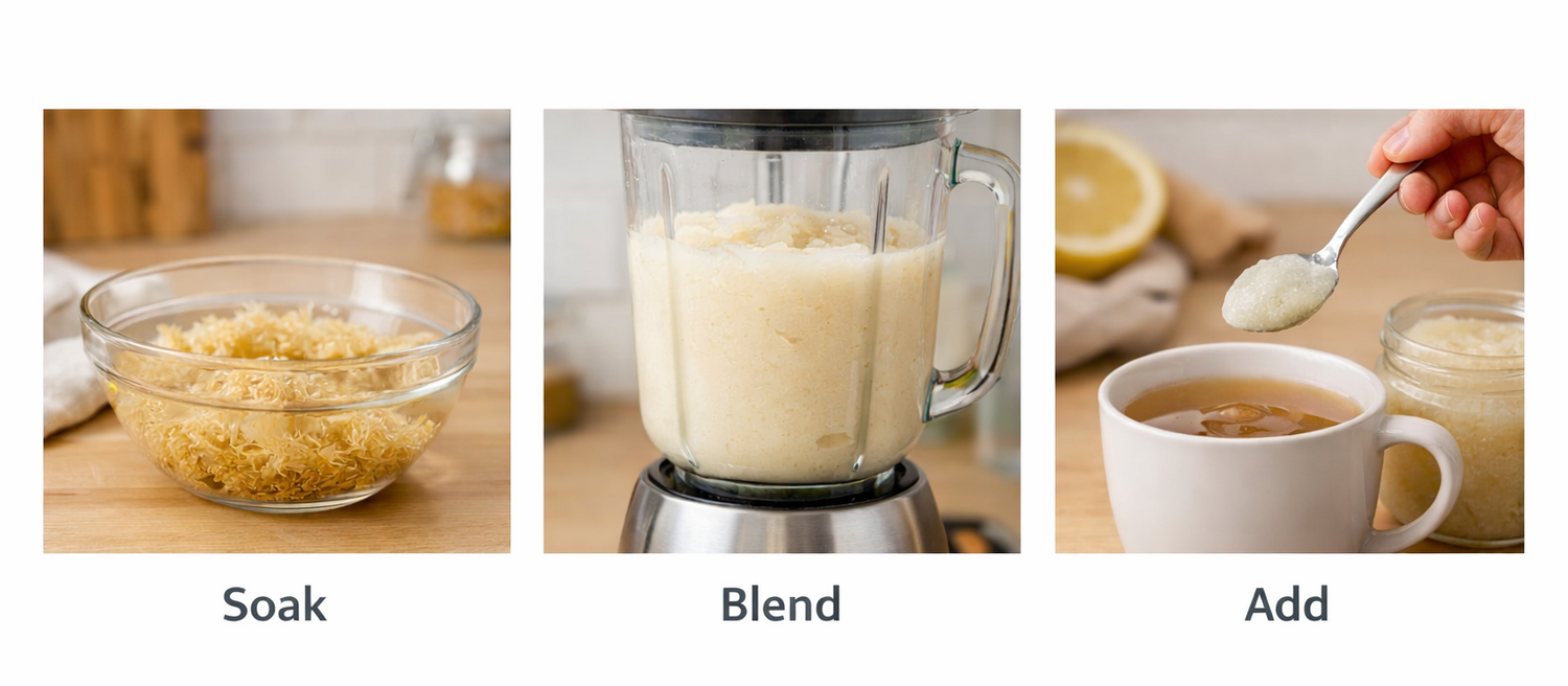 Sea moss is typically soaked, blended into a gel, and added to foods or beverages as a way to add dietary fiber and minerals to your diet.