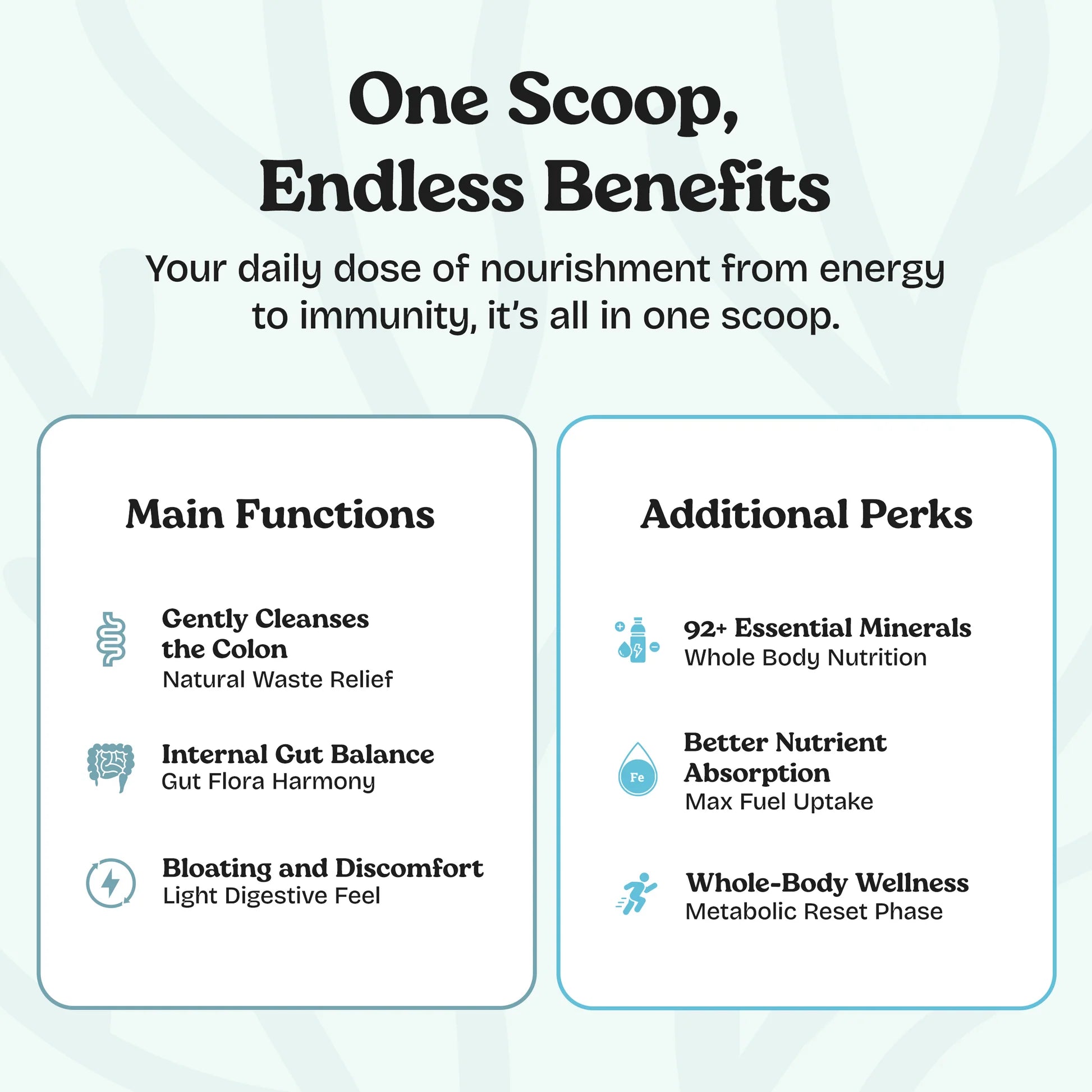 Our easy-to-mix blend is gentle on the body and boasts the regenerating power of Sea Moss coupled with a robust Colon and Para Cleanse blend, which includes Psyllium Husk, Black Walnut Powder, Wormwood Extract, Clove extract, Neem Powder, and MSM.