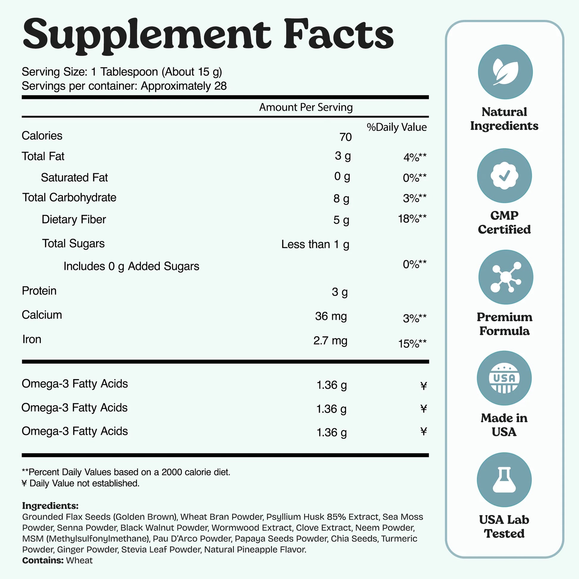 Grounded Flax Seeds (Golden Brown), Wheat Bran Powder, Psyllium Husk 85% Extract, Sea Moss Powder, Senna Powder, Black Walnut Powder, Wormwood Extract, Clove Extract, Neem Powder, MSM (Methylsulfonylmethane), Pau D’Arco Powder, Papaya Seeds Powder, Chia Seeds, Turmeric Powder, Oregano Powder, Stevia Leaf Powder, Natural Pineapple Flavor.