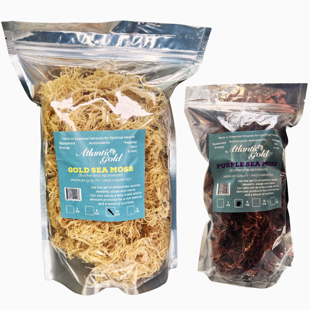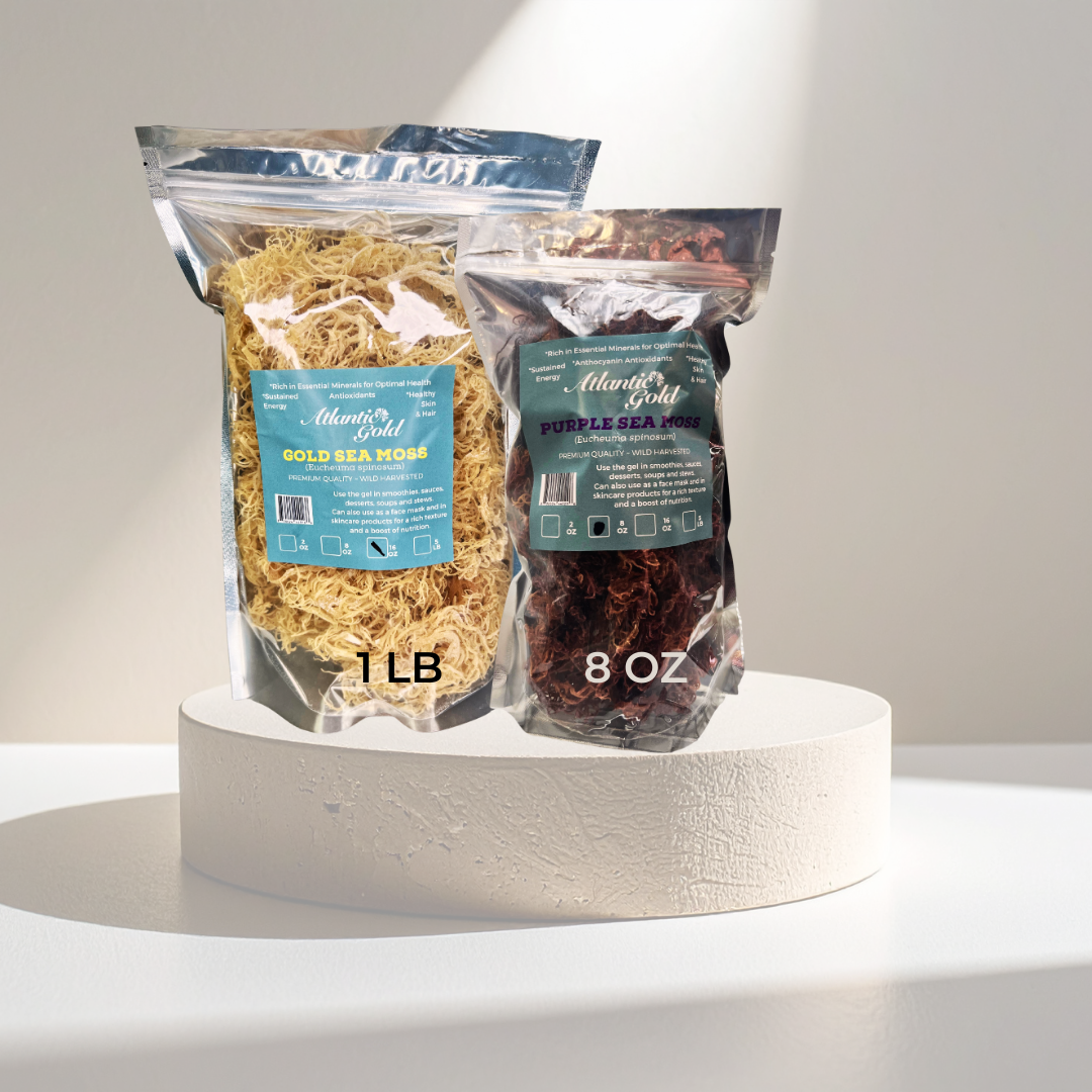 This dynamic duo combines 1 lb of nutrient-rich gold sea moss with 8 oz of potent purple sea moss, giving you the synergistic benefits of both varieties in one convenient package.