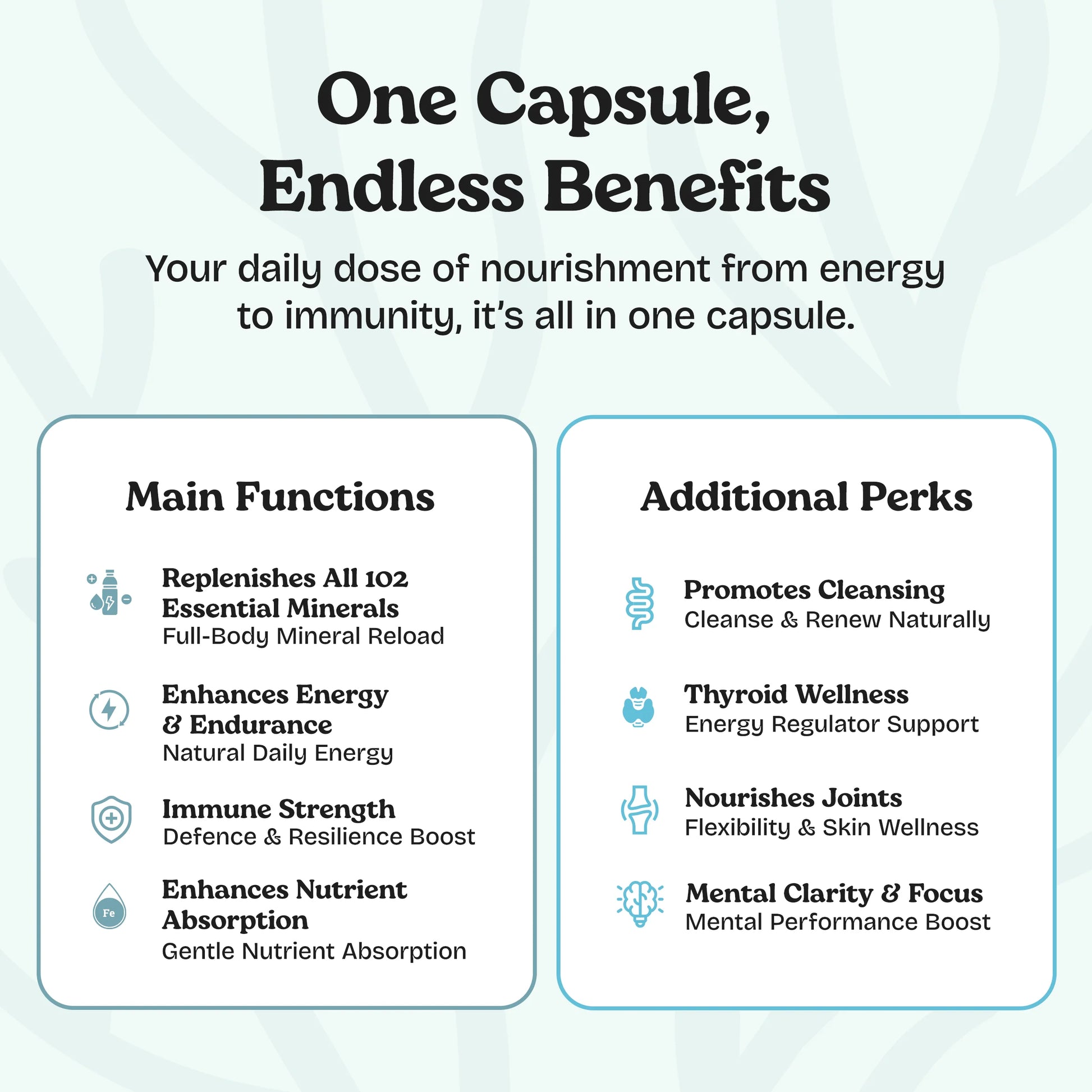 This advanced formula combines wildcrafted Sea Moss, Shilajit, Bladderwrack, Burdock Root, and Black Pepper — five powerhouse ingredients that work synergistically to deliver all 102 minerals the human body needs.